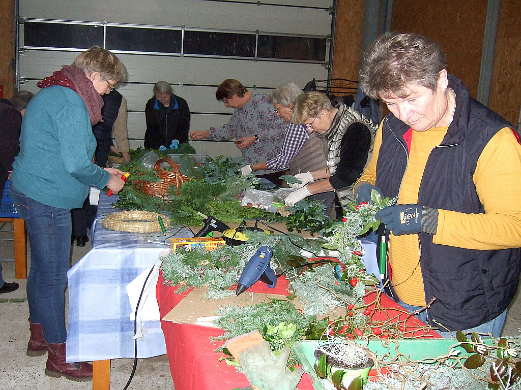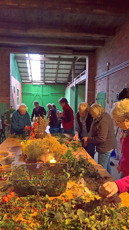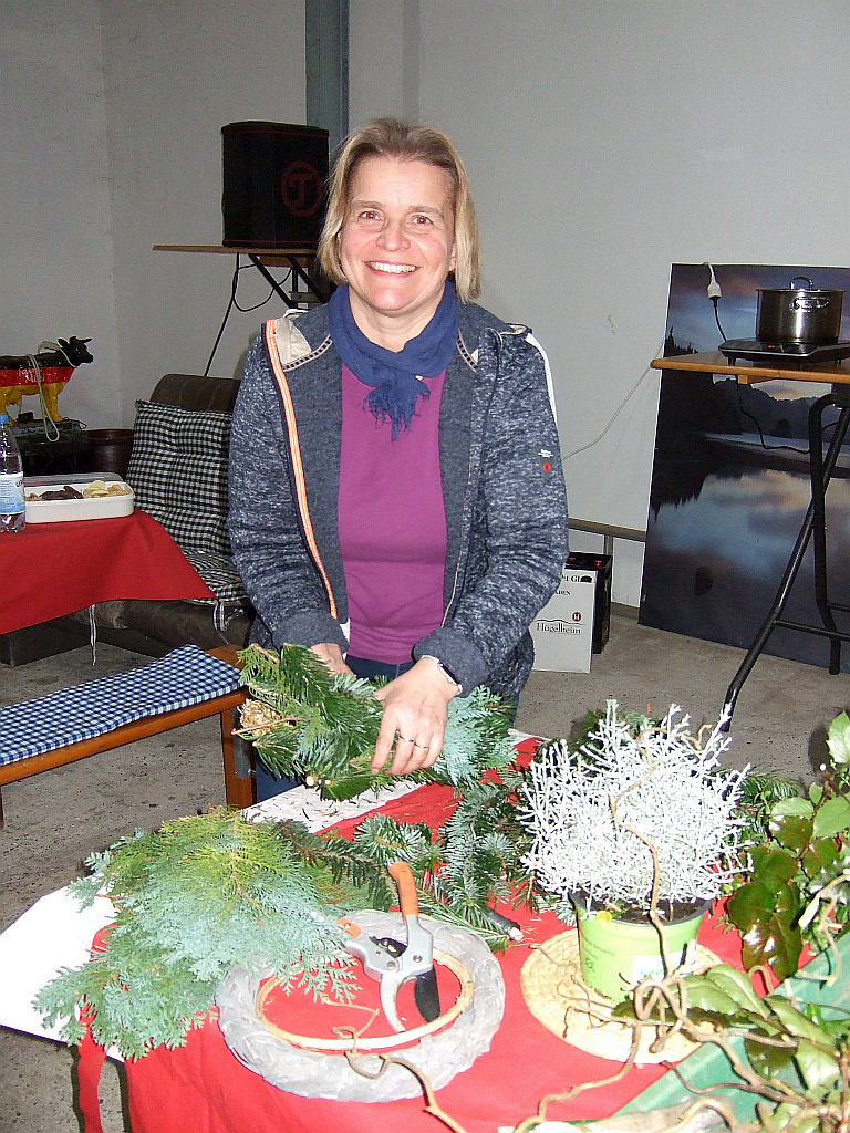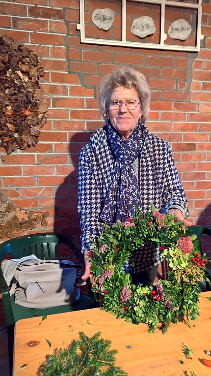 Die Gruppe wurde geteilt, so dass um 14 Uhr elf und um 17 Uhr 10 bastelfreudige Damen erschienen. Angela unterstützte uns bei der Herstellung der Kränze mit Rat und Tat. Unter ihrer Anleitung entstanden, auch bei ungeübten Kranzbinderinnen, erstaunlich gute Resultate, da beim Material bzw. bei der Deko keine Grenzen gesetzt sind. Die Natur stellt uns um diese Jahreszeit fast alle Materialien zur Verfügung, ob Hortensien, Fette Henne, Hagebutten, Buchsbaum Koniferen oder Lampionblumen; Angela hatte uns bestens eingedeckt.
