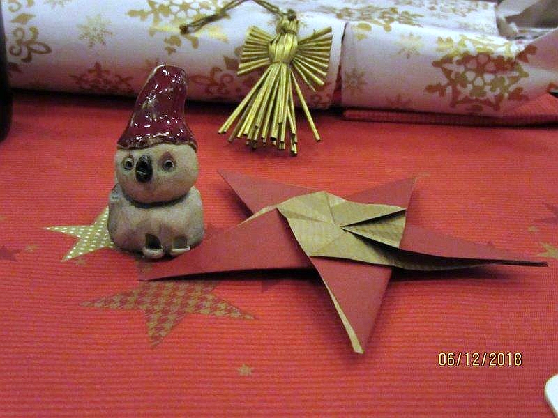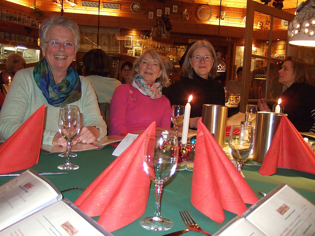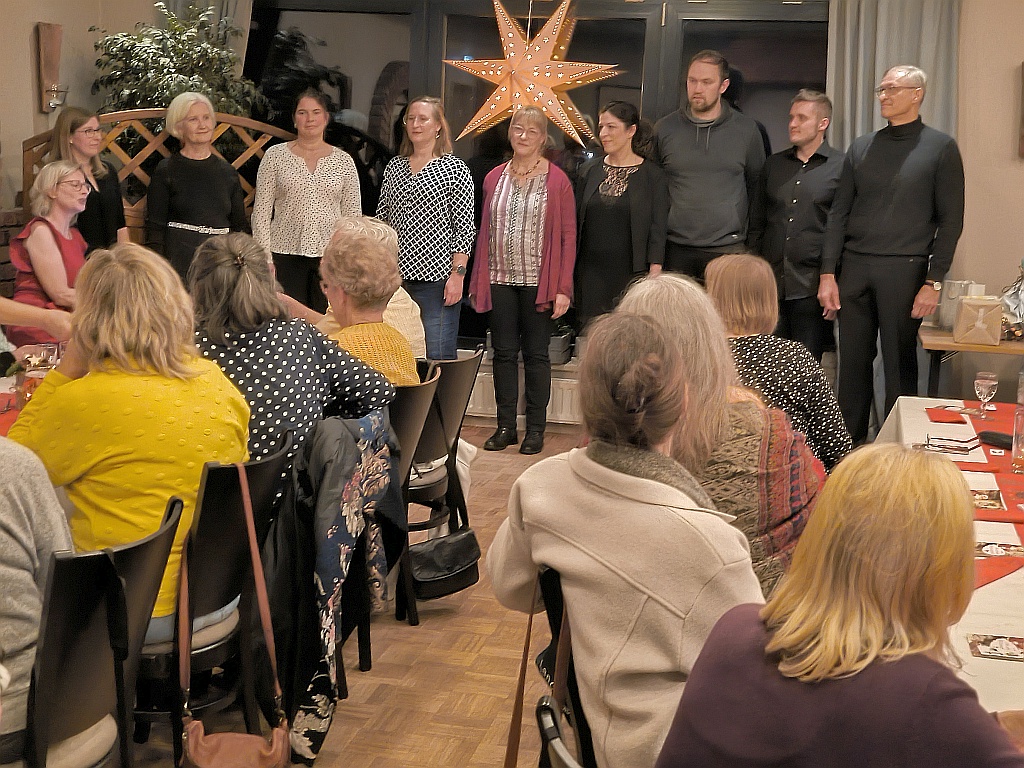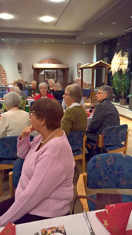 6 Landfrauen trafen sich zur Weihnachtsfeier im Jock´s. Nach dem Essen gab es eine Gesangseinlage, der Chor „Vocal Chapters“, präsentierte weihnachtliche Popsongs. Natürlich wurden auch bekannte deutsche Lieder, mit Unterstützung der Damen, gesungen. Es hörte sich sehr schön an. Dann stieg die Spannung, Julklapp stand auf dem Plan. Jede Teilnehmerin brachte ein kleines Geschenk mit, im Losverfahren konnte sich jede Dame ein Päckchen vom Geschenketisch aussuchen. Nach ausgiebiger Begutachtung der Gaben endete eine stimmungsvolle, harmonische Weihnachtfeier. Jede Landfrau bekam zum Abschied einen (vom Vorstand) selbstgebastelten Papierstern.