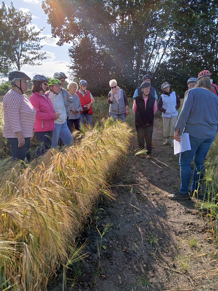 Mit dem Fahrrad fuhren wir durch die Feldmark in Stuvenborn. Viktoria hatte sich angeboten uns etwas über Feld und Flur zu berichten. Unser erster Anlaufpunkt war eine abgemähte Wiese. Hier erfuhren wir, dass am äußeren Ende ein Altgrasstreifen stehen bleiben muss, damit die Tiere ein Rückzugsort haben. 30 % Dauergrünfläche , so die gesetzliche Vorgabe, ist einzuhalten.