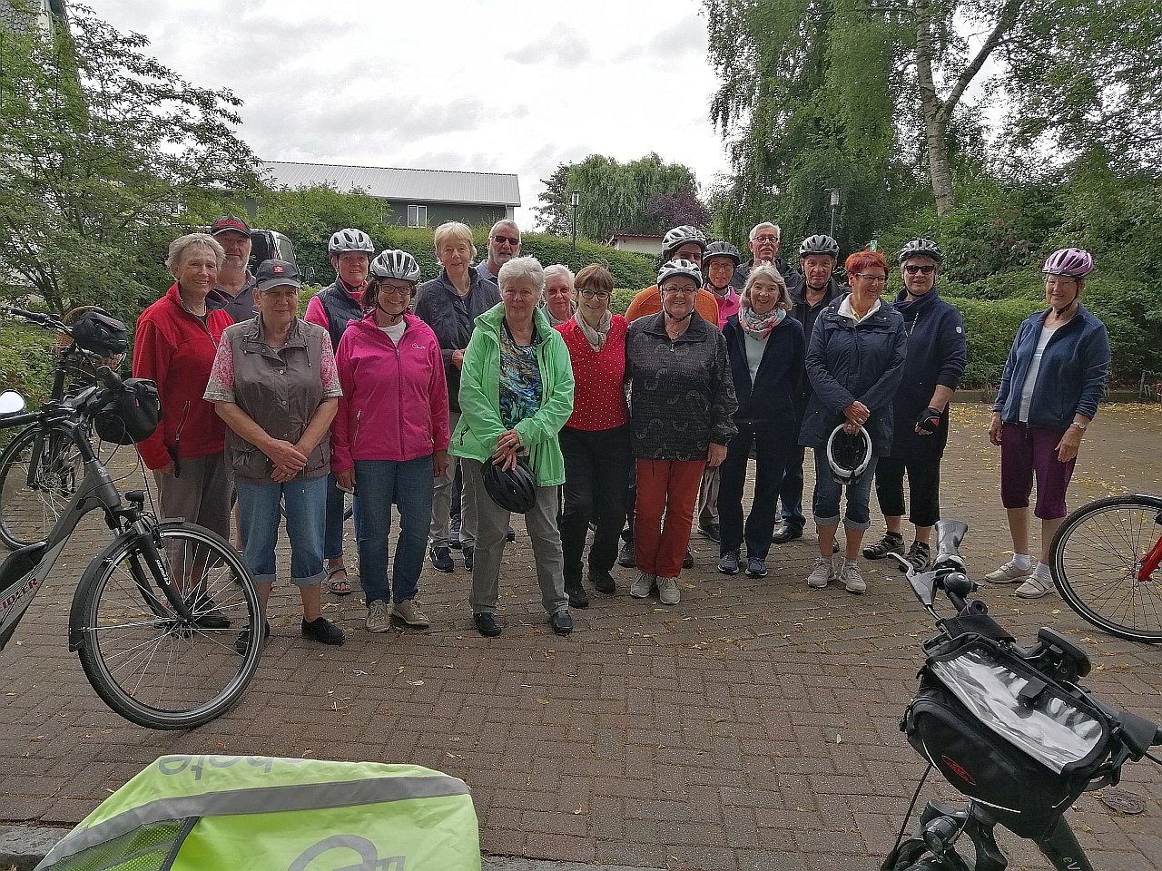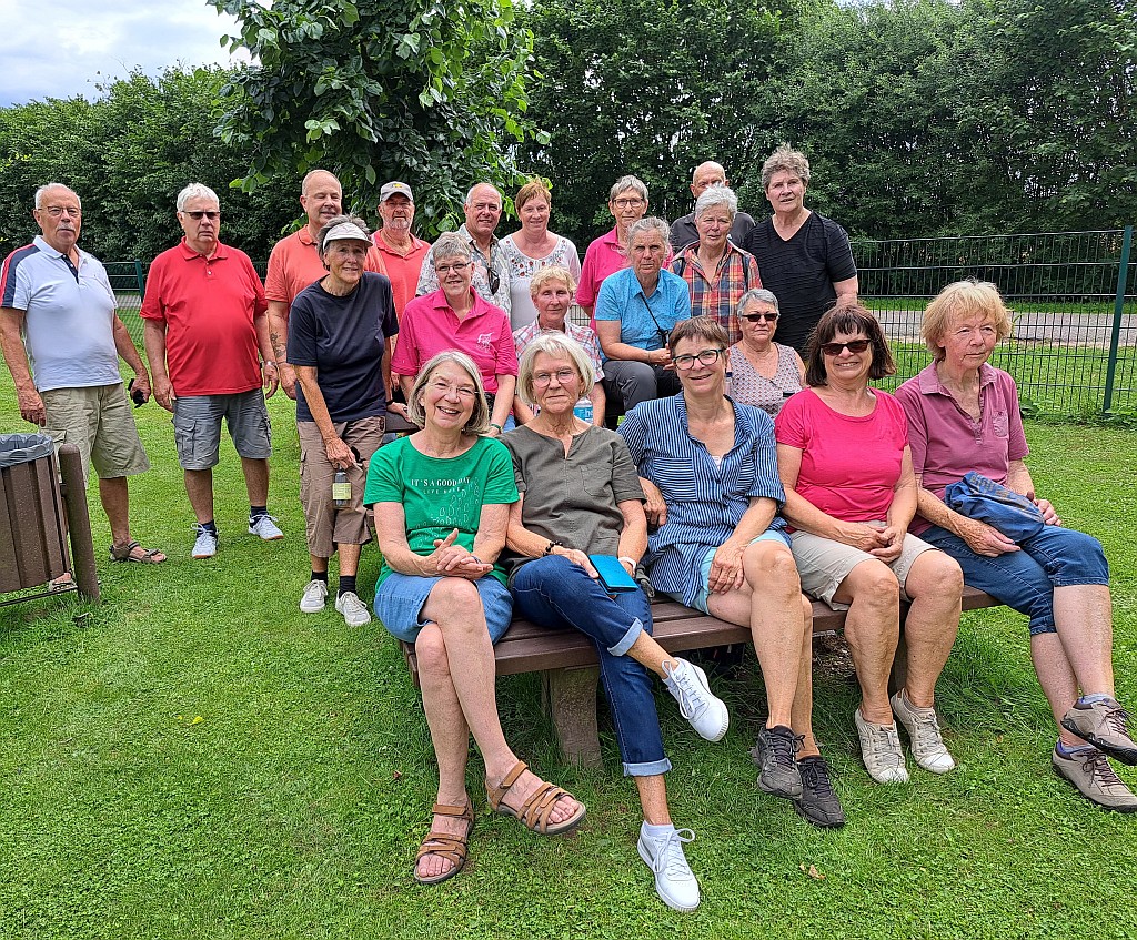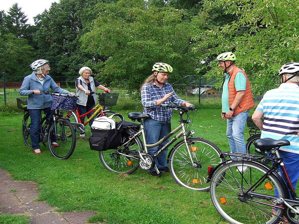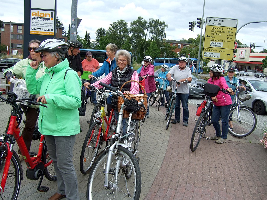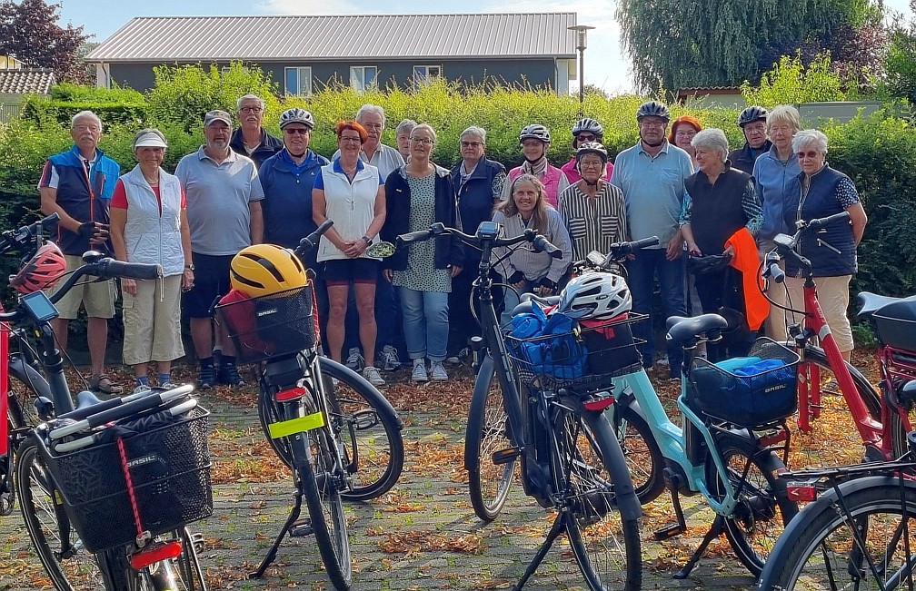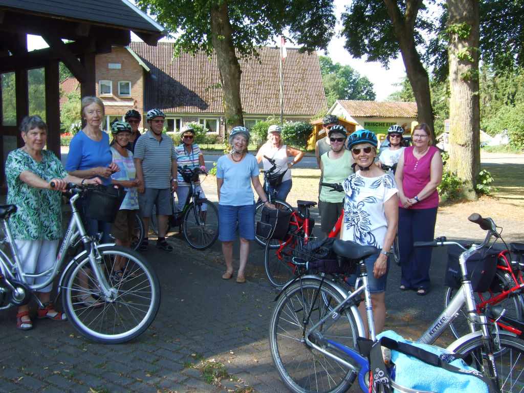 Eine große Radtour stand auf dem Programm der Landfrauen Stuvenborn und Umgebung. Bei bestem Wetter machten sich 23 Teilnehmer auf den Weg, Familie Schröder hatte wieder eine schöne Tour (mit unbekanntem Ziel für die Radler) ausgearbeitet. Von Stuvenborn ging es über Bredenbekshorst, Struvenhütten, Schmalfeld nach Bad Bramstedt ins Kurgebiet. Hier wurde eine Mittagspause gemacht, einige nutzten die Zeit um im Kneippbecken die Beine zu vertreten. Auf der Rückfahrt gab es leider eine Panne, die dank vieler Helfer (Ersatzteile, E-Pumpe und fachmännischer Handgriffe) schnell behoben werden konnte. Nach ca. 4,5 Stunden und gefahrene 50 km kehrte die Gruppe zu Kaffee und Kuchen bei Familie Mehrkens in Sievershütten ein.