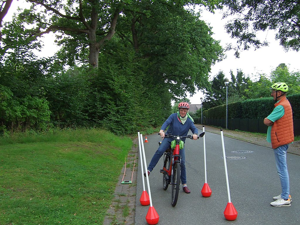 Nach der Theorie befuhren die Teilnehmer einen kleinen Parcours, in Schlangenlinien um die Kegel, über ein Wippbrett, Kopfsteinpflaster, aus voller Fahrt an einem bestimmten Punkt zum Stehen kommen. Ganz so einfach, wie man es sich vorgestellt hatte, war es dann doch nicht.