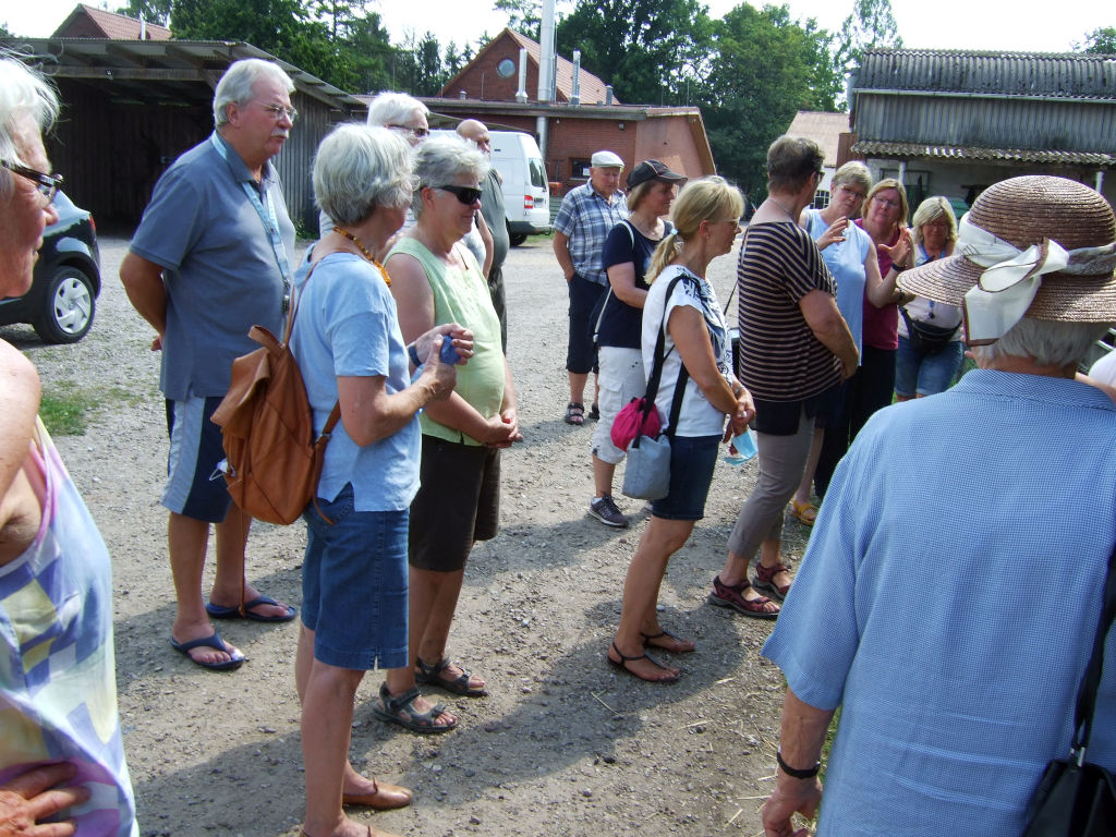 Trotz der großen Hitze, trafen sich 17 Radler um, an der von Familie Schröder ausgearbeiteten Tagestour, mitzufahren. Die Strecke führte über Struvenhütten, Voßhöhlen, durch das Barker Moor, Bockhorn, durch den Segeberger Forst ins Hochmoor von Hasenmoor. Kleine Pausen zwischendurch waren nötig um den Wasserhaushalt wieder aufzufüllen. Auf dem Demeter-Hof Ehlers, hier stießen vier weitere Teilnehmer dazu, unternahmen die Radler einen Rundgang mit Frau Steenbock, Inhaberin in vierter Generation. Sie erzählte von den, teilweise hilfsbedürftigen Menschen, die in der Lebens- und Arbeitsgemeinschaft des Hofes ihre Aufgaben finden. Die aufgezogenen Schweine, Hühner, Gänse und Rinder werden vermarktet, Brot wird gebacken und das angebaute Gemüse, das alles wird im Hofladen verkauft. Im angrenzenden Café gab es Kaffee und Torte und/oder Kaltgetränke. Der Rückweg führte über Wolfsberg, Struvenhütten, Bredenbekshorst nach Stuvenborn. Die zurückgelegte Strecke betrug 50 Km, die Organisatoren bekamen als kleines Dankeschön einen Eisgutschein.