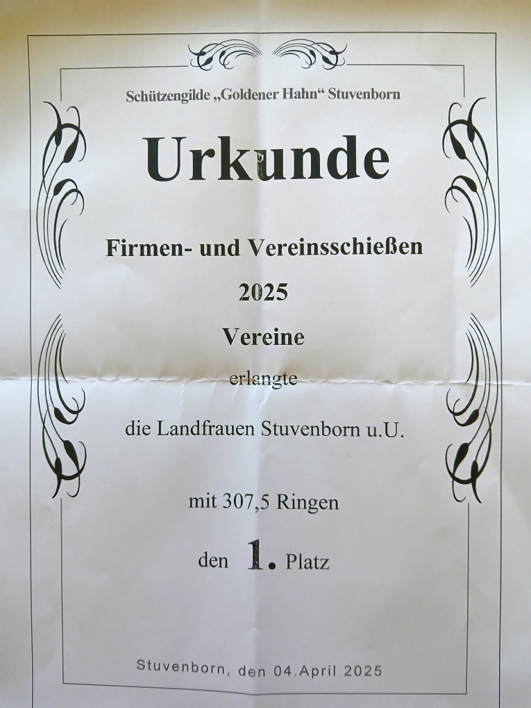 Bei den Vereinen belegten einen guten dritten Platz die Mitglieder des FFW Stuvenborn mit 300,4 Ringen, auf den zweiten Platz schoben sich die Mitglieder der CDU mit 303,8 Ringen, mit deutlichen Abstand setzen sich die Mitglieder der Landfrauen Stuvenborn u.Umgebung mit sagenhaften 307,5 Ringen an die Spitze.