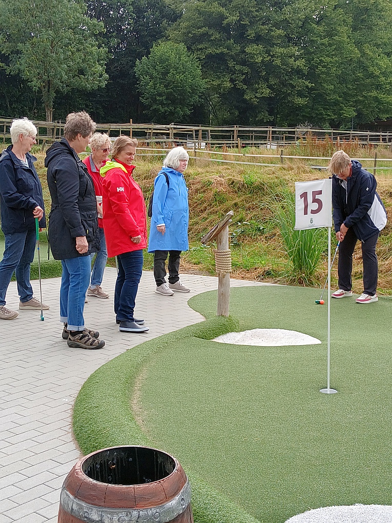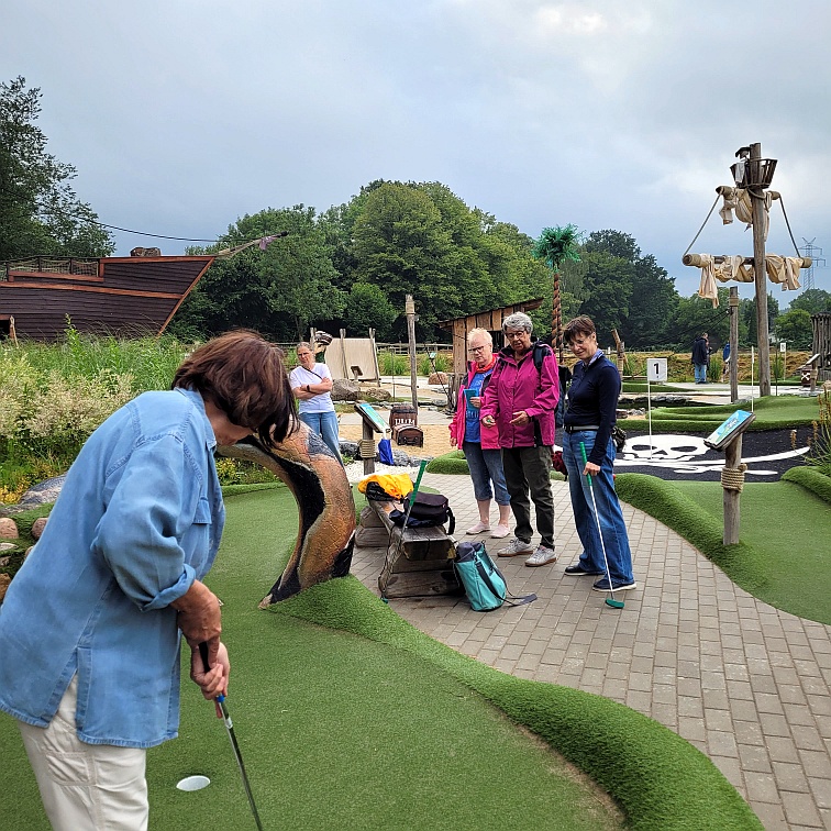 Am 18.7. haben sich 12 Landfrauen zum „Adventure Golf“ im Stadtpark Norderstedt getroffen. Bei bombigem Wetter und guter Laune wurden 4 Gruppen gebildet und los ging der Spaß. Die Golfanlage ist perfekt für alle, die das Abenteuer mit dem kleinen Ball in pink, gelb oder weiß suchen. 18 moderne neongrün-gelbe Bahnen laden mit ihren spannenden Hindernissen ein. Anfänger und Fortgeschrittene können hier den perfekten Schwung üben und ihre Ballkunst unter Beweis stellen. Nach einer Spielzeit von 1,5 Std. hat jeder für sich festgestellt: „Super, es geht doch“. Eine kleine Wanderung zum Norderstedter Strandhaus, hier gab es Kaffee und Kuchen, rundete den Nachmittag ab.