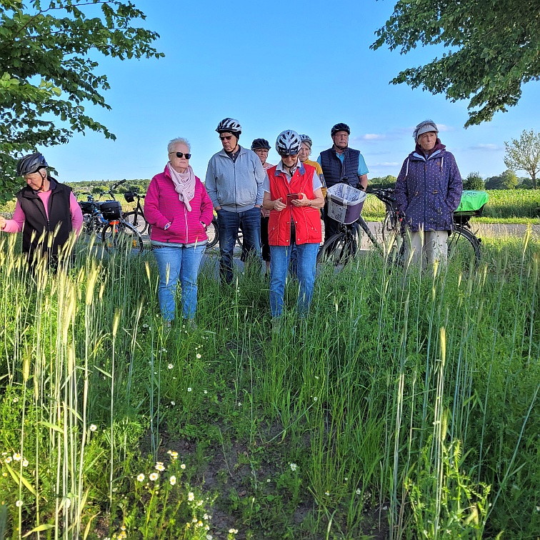 Mit dem Fahrrad fuhren wir durch die Feldmark in Stuvenborn. Viktoria hatte sich angeboten uns etwas über Feld und Flur zu berichten. Unser erster Anlaufpunkt war eine abgemähte Wiese. Hier erfuhren wir, dass am äußeren Ende ein Altgrasstreifen stehen bleiben muss, damit die Tiere ein Rückzugsort haben. 30 % Dauergrünfläche , so die gesetzliche Vorgabe, ist einzuhalten.