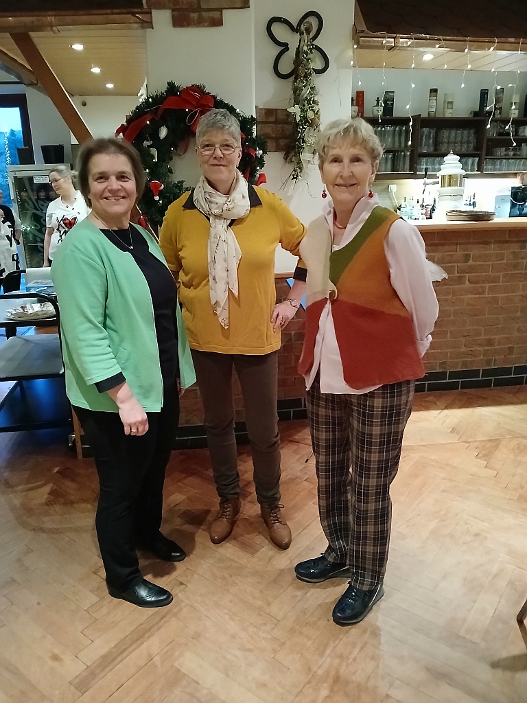 6 Landfrauen trafen sich zur Weihnachtsfeier im Jock´s. Nach dem Essen gab es eine Gesangseinlage, der Chor „Vocal Chapters“, präsentierte weihnachtliche Popsongs. Natürlich wurden auch bekannte deutsche Lieder, mit Unterstützung der Damen, gesungen. Es hörte sich sehr schön an. Dann stieg die Spannung, Julklapp stand auf dem Plan. Jede Teilnehmerin brachte ein kleines Geschenk mit, im Losverfahren konnte sich jede Dame ein Päckchen vom Geschenketisch aussuchen. Nach ausgiebiger Begutachtung der Gaben endete eine stimmungsvolle, harmonische Weihnachtfeier. Jede Landfrau bekam zum Abschied einen (vom Vorstand) selbstgebastelten Papierstern.